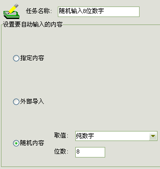 因为手机号码都是11位,故再输入8位数字即可。后面8位我们采用随机数字来输入,通过“自动输入”任务里的“随机内容”完成,取值选“纯数字”,位数填8即可,如下图所示:
