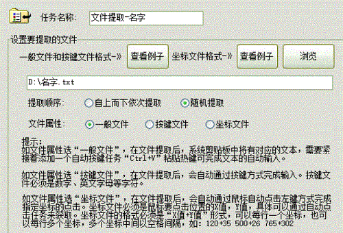 再添加“文件提取”任务,浏览选择我们事先的名字文件,采用“随机提取”的顺序,如下图所示: