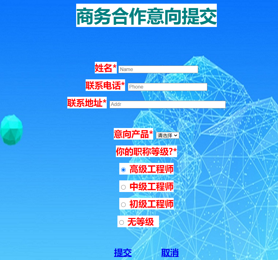 界面上有姓名、电话、地址这种的文本框,也有意向产品这种的下拉框,还有职称等级这种的点选框,我们需要分别进行准备和操作。