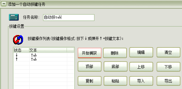 所以这里我们就用自动按键任务,捕获tab键。注:在脚本编排中,尽可能多用自动按键任务,因为这样不管窗口大小是否变化,也不用调整。而如是自动点击设置的坐标,那就需要重设。