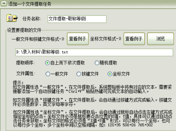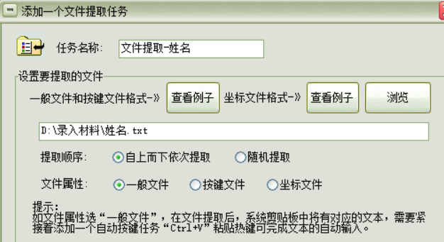 5-然后就开始数据录入了,因为我们已经从Excel里生成TXT文件了,所以就可以直接用阿冲全能点击王的文件提取任务依次每行录入了,因为姓名是汉字非数字字母,要选”一般文件“选项,