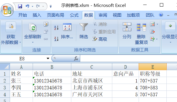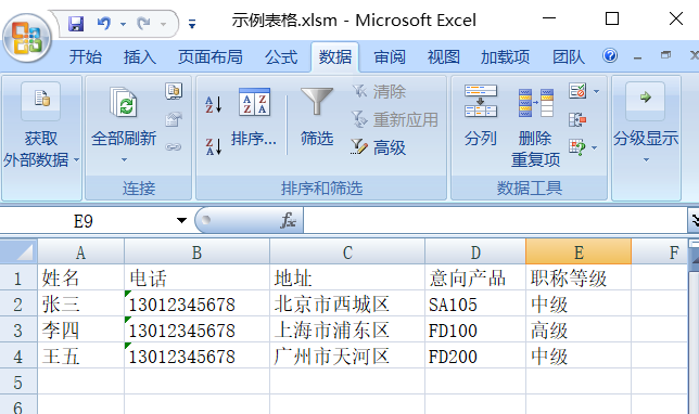 1-首先,准备一个带有宏的Excel表格,文件后缀名是xlsm,表格数据我们这里是随便举例了3行,后续大家可以仿照格式在后面整理即可,表格数据要和界面上输入的内容是一一对应。