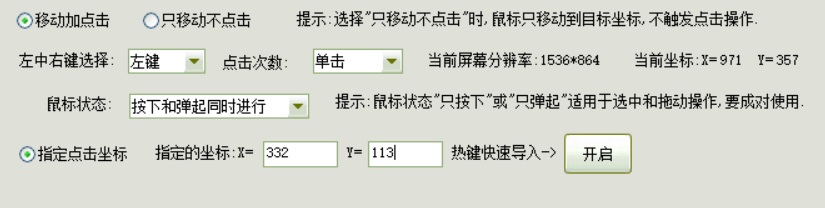 7-指定点击坐标:用于设置特定位置的点击,按下右边的“热键快速导入-》开启”,会有提示内容:通过按某某键可将当前鼠标坐标快速导入,先在任意想点击的地方把鼠标挪过去,按下上边的热键,然后会提示“导入当前坐标成功!当前坐标:X=***,Y=***”消息框,在对应的“指定的坐标”输入框会自动填充刚才鼠标位置的坐标。