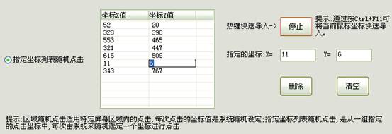 9-指定坐标列表随机点击:是从一组指定的点击坐标中,每次由系统来随机选定一个坐标进行点击。允许的最多指定坐标数目为20个。操作同上边“7-指定点击坐标”一样,可通过热键快速导入。同时也支持坐标列表的“删除”和“清空”功能,通过对应的功能按钮完成,坐标列表也支持编辑功能,可直接双击列表中的某一项,进入编辑状态。