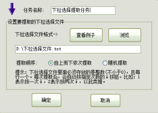 下拉选择文件格式为:正整数+换行符,即每行一个数字。通过点“浏览”选择要提取的下拉选择文件。下面提取顺序分:“自上而下依次提取”和“随机提取”两种。如下所示: