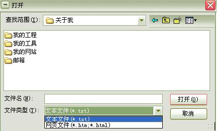 选择“外部导入”时,可以自动输入外部文件的内容,点“浏览”出现选择文件对话框,下面文件类型不仅可以选择文本文件.txt格式的,也可以选择网页文件.htm和.html格式的。