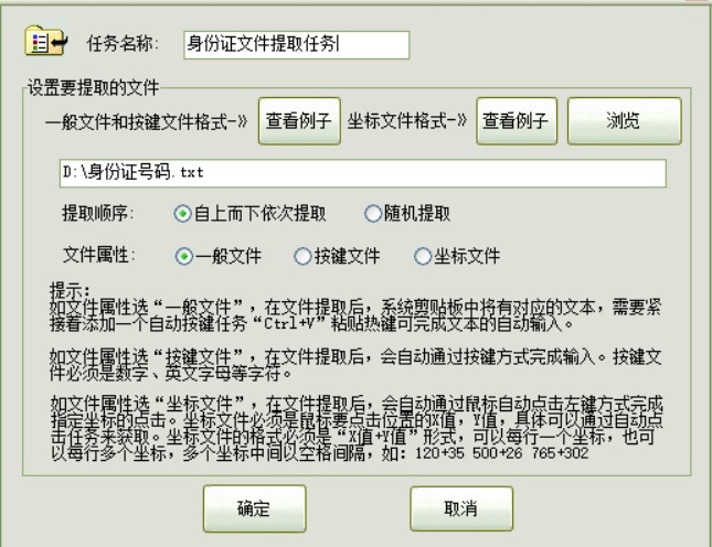 支持对一般文件、按键文件和坐标文件的提取功能,可以自上而下或者随机顺序提取,可以从文件里循环提取自动录入,可以自动打字按键输入,可以自动提取坐标进行鼠标点击。