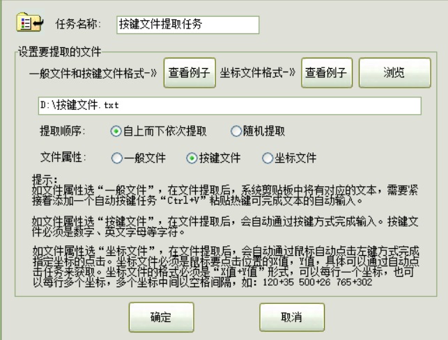 文件属性分为一般文件、按键文件和坐标文件三种,如文件属性选“一般文件”,在文件提取后,系统剪贴板中将有对应的文本,需要紧接着添加一个自动按键任务“Ctrl+V”粘贴热键可完成文本的自动输入。